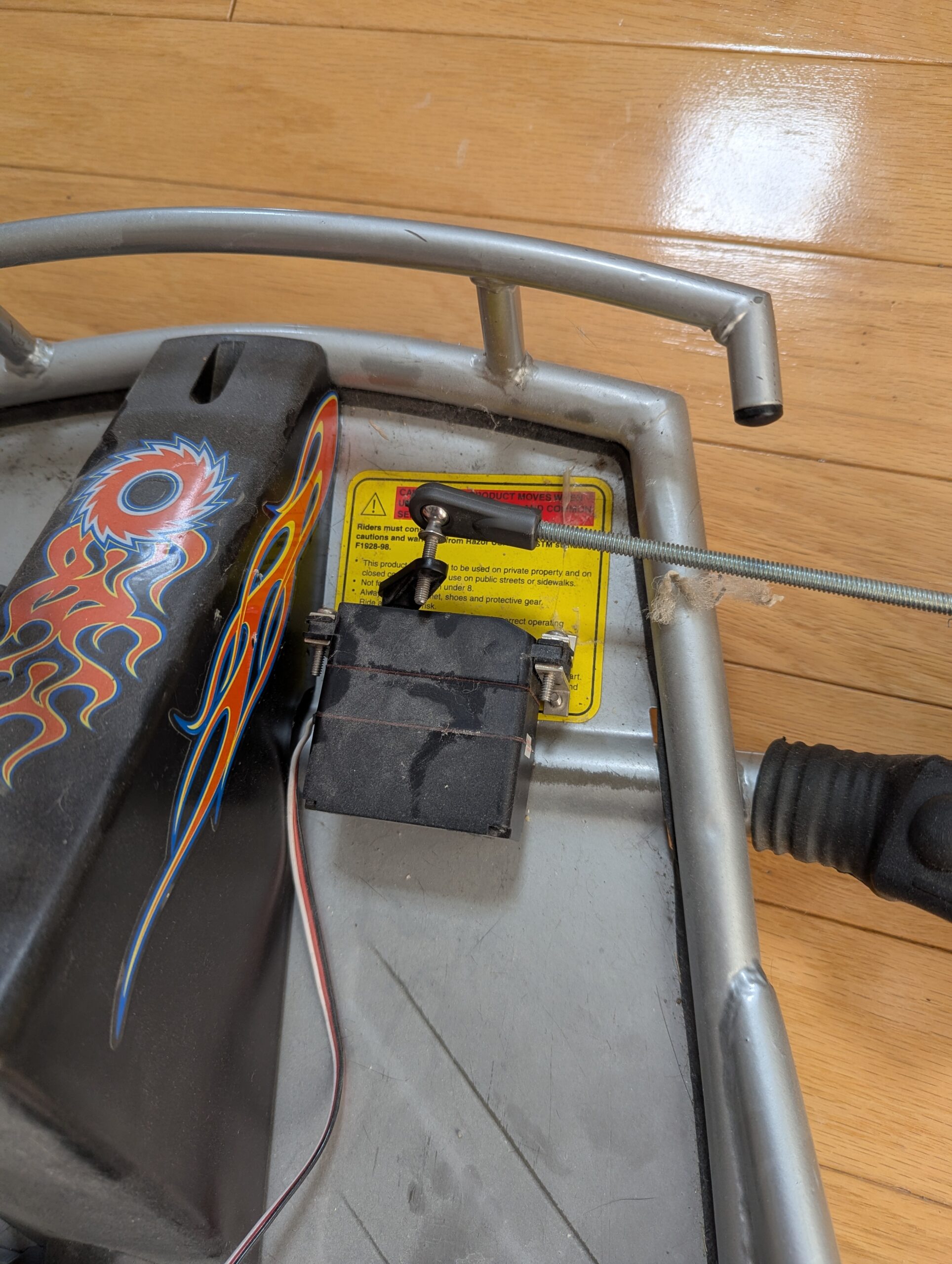 Our kids eventually grew too big to use their Razor Go-Kart and since it was it was just lying around… I decided to see if I could Remote Control it! I originally built it out to connect by Bluetooth, but realized quickly that range and connectivity wasn’t great so I swapped out the Arduino board for a Wi-Fi Direct compatible board. The control was done via an Android app that you tilted left/right like a steering wheel with a thumb throttle control. All components (kart, servos, controller) were powered by the main go kart battery with the micro devices connected through a 5V buck converter as the high torque servers needed more amps that the 500ma provided by smaller batteries. Because I didn’t want to replicate a speed controller, I designed a custom adapter to pull the existing thumb lever for speed. We revamped for Gish Halloween event, won that category and were added to the Hall of Fame!